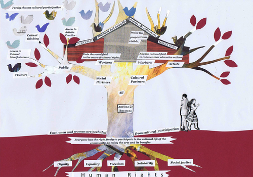 Pour nous, il s’agit de changer les regards et d’agir au quotidien pour que ne s’opposent plus : le droit à un logement, le droit de manger à sa faim, le droit à l’enseignement, … avec le droit de nourrir son esprit et ses sens, de questionner son environnement et d’y contribuer par l’accès aux œuvres, par la production de sens nouveau via les expressions critiques et ou artistiques, par la valorisation des diversités culturelles. Ce qui nécessite de questionner, d’analyser, de créer certaines pratiques mêlant au moins les champs social et culturel.