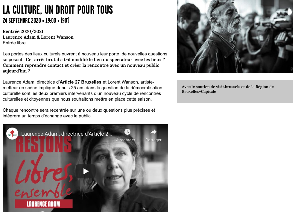Laurence Adam est intervenue pour Article 27 Bruxelles aux côtés de Lorant Wanson (metteur en scène) devant un public d’une trentaine de personnes issues des milieux culturels, sociaux, institutionnels ainsi que de citoyens.