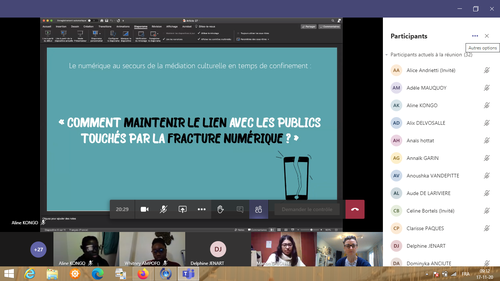 La conférence-débat a eu lieu le 17 novembre 2020. Au cours de la matinée, les étudiantes ont exposé plusieurs sujets que nous venions exemplifier d’actions concrètes. Notamment, “s’adapter au confinement : médiation culturelle, publics et fracture numérique”, en reprenant ici le travail réalisé parallèlement sur le site Internet et via les carnets d’activités "printemps" et "été" (en version imprimable et imprimée) nous avons pu montrer en quoi maintenir le lien avec la culture a été un enjeu dès le début du confinement, qu’il passe ou non par le numérique.