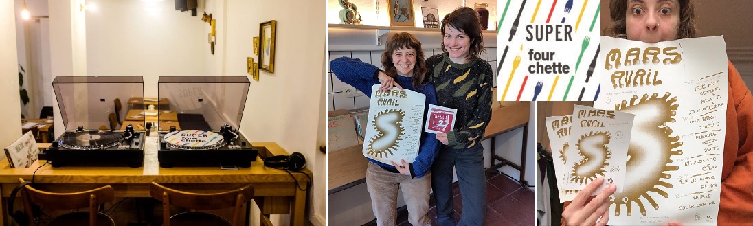 Super Fourchette est un resto / disquaire / café-concert, situé dans le cen- tre-ville de Bruxelles, qui, depuis 4 ans, organise 2 à 4 fois par mois des concerts de post-punk et de rock et propose une sélection de disques vinyle et cassettes de groupes et labels indépendants.
